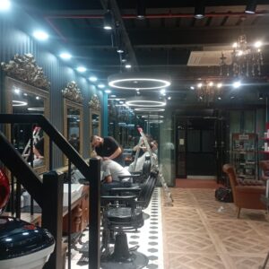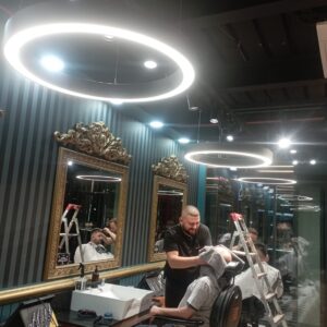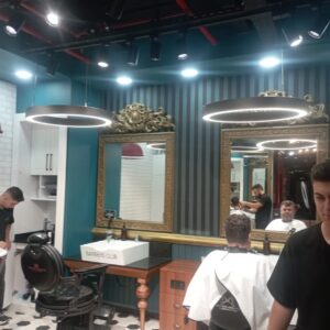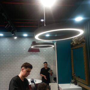 Çözümümüz, iki katmanlı bir sistem oldu: Tavandaki büyük LED halkalar genel ve dolaylı ışık sağlarken, her istasyona özel olarak konumlandırılan ray spotlar, berberin çalışma açısına göre ayarlanabilen, güçlü ve net bir görev ışığı sundu. Bu birleşim, hem estetik bir imza yarattı hem de teknik olarak kusursuz bir altyapı sağladı.